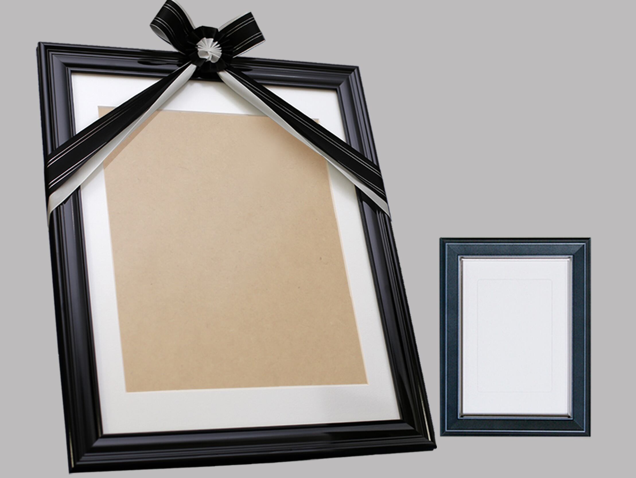 四切サイズのお写真とハガキサイズのお写真をセットできる歴史ある黒額縁セットです。リボンの色はブラックをお付けしております。